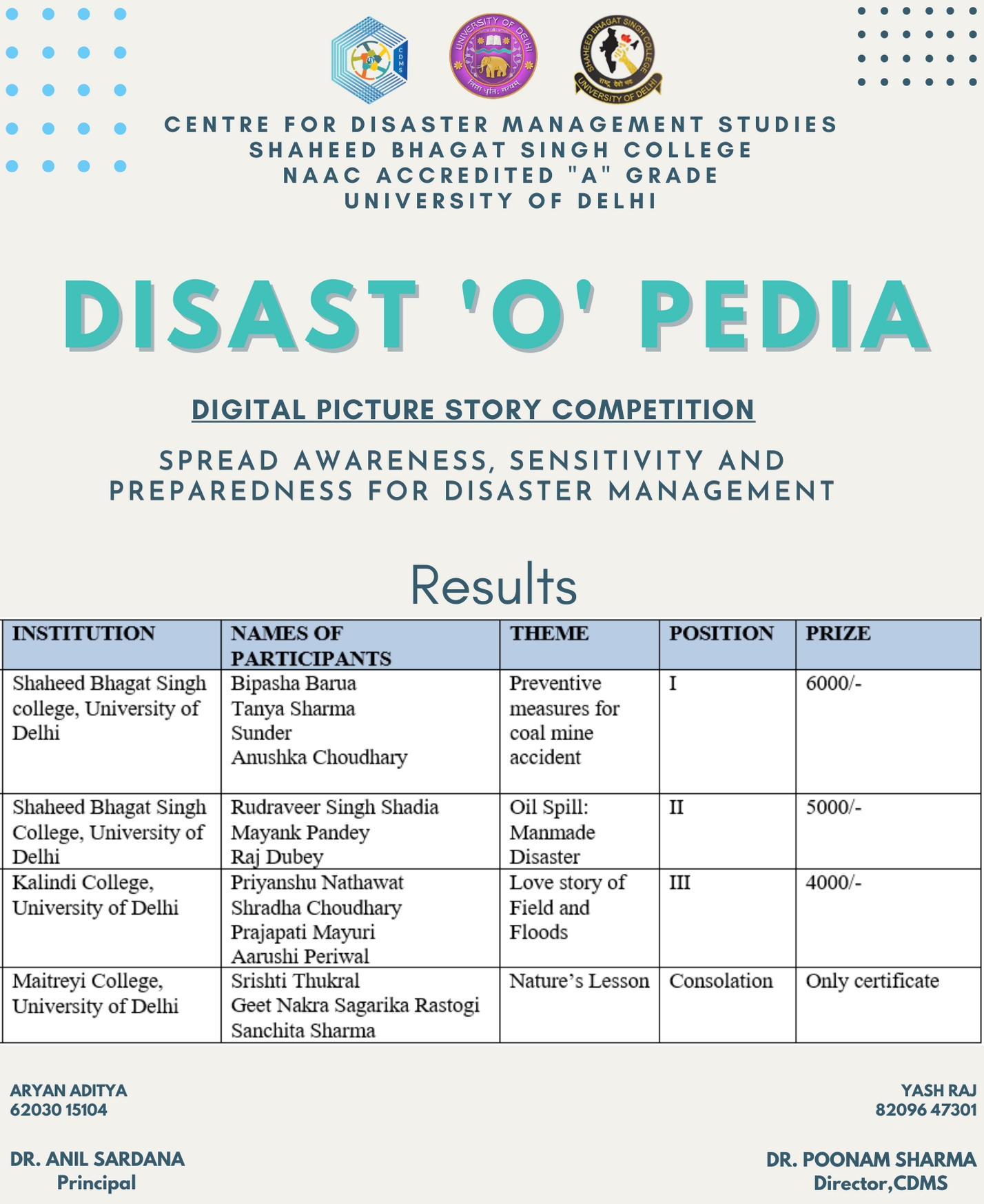 To instill a sense of awareness about the various aspects and intricacies of Disaster Management, Centre for Disaster Management Studies(CDMS) organised "Disast 'O' Pedia: A Digital Picture Story Competition" in November, 2020. The competition was open to both undergraduate and postgraduate students. The theme for the competition was chosen as "Spread Awareness, Sensitivity and Preparedness for Disaster Management." Overall, it was an enthralling event with overwhelming response and participation from students across colleges and universities.